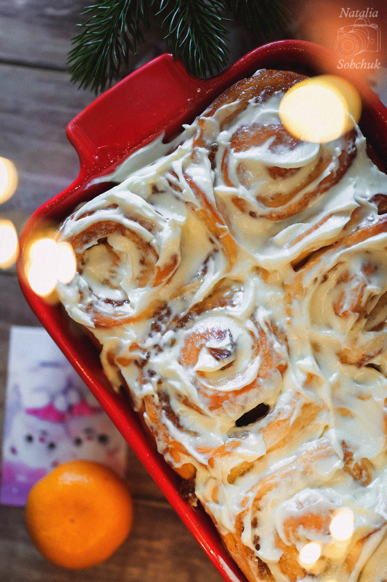 Разместите их в форме для выпекания, накройте пленкой и оставьте на 15 минут. Выпекайте в разогретой до 180°C духовке в течение 30 минут. Когда булочки станут золотистыми, дайте им немного остыть перед тем, как покрыть прохладным сливочным кремом, приготовленным из взбитого сливочного масла, творожного сыра и сахарной пудры.