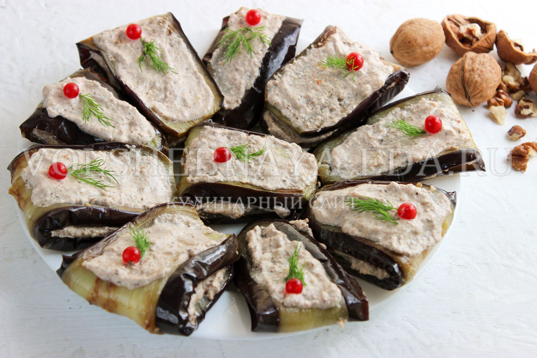 Полученную массу следует разбавить холодной кипяченой водой до консистенции густой сметаны, подправив уксусом и солью. Бумажным полотенцем просушите баклажаны и щедро намажьте ореховой смесью, затем сложите их пополам, создавая «язычки». Завершив сборку закуски, оставьте её пропитываться в холодильнике минимум на 3-4 часа — лучше на ночь.