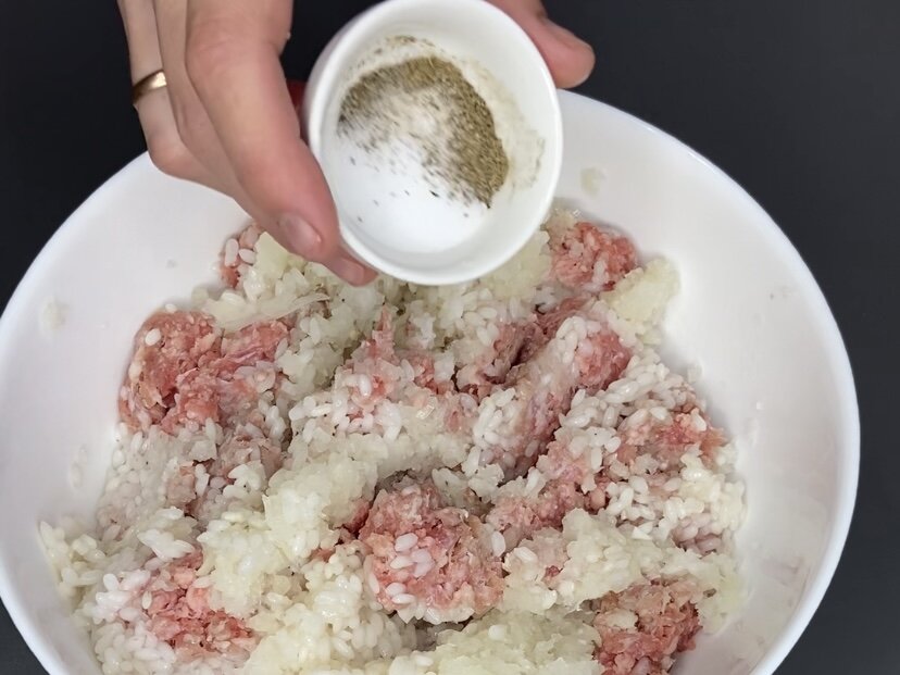 Для начала стоит подготовить начинку. Свиной фарш смешивается с мелко нарезанным репчатым луком. Рис необходимо слегка отварить и добавить к фаршу вместе с солью и черным перцем. Хорошо перемешать и отбить, чтобы масса стала однородной.