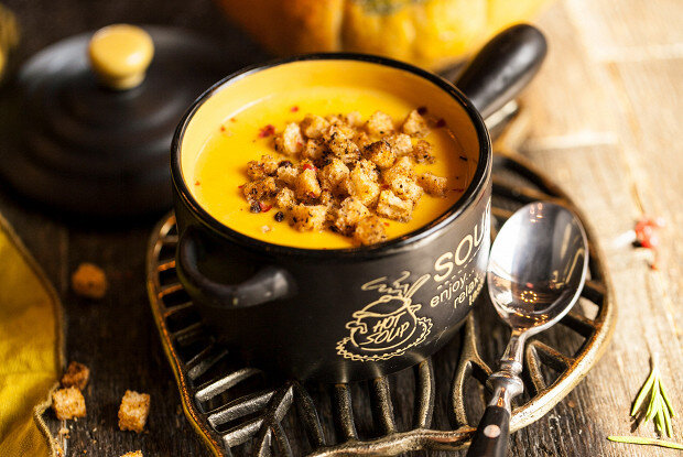Нарезанную и очищенную тыкву вместе с репчатым луком следует разместить в кастрюле. Обжарить на смеси растительного и сливочного масла до появления аппетитной золотистой корочки.К овощам добавить зерна кукурузы и залить овощным бульоном. Доведите до кипения и варите до готовности тыквы.Получившуюся массу тщательно измельчить с помощью блендера. Перелить обратно в кастрюлю, добавить сливки, соль, сахар и чесночное масло. Довести до кипения, помешивая.При подаче украсить суп гренками для дополнительного хруста и презентации.Для получения новых и интересных рецептов, загляните на сайт еда.ру, сообщает Еда.ру.