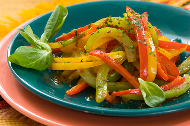 Перед началом готовки очищаем жгучий и сладкие перцы от семян и плодоножек, нарезаем их полосками, а затем обжариваем на половине масла. Из остального масла готовим заправку: смешиваем его с белым уксусом, добавляем мелко нарезанный базилик, толченый чеснок, соль и черный перец. Обжаренные перцы заливаем полученной заправкой, пока они еще теплые. Все тщательно перемешиваем и оставляем на пару часов, хотя этот салат идеально подается охлажденным.