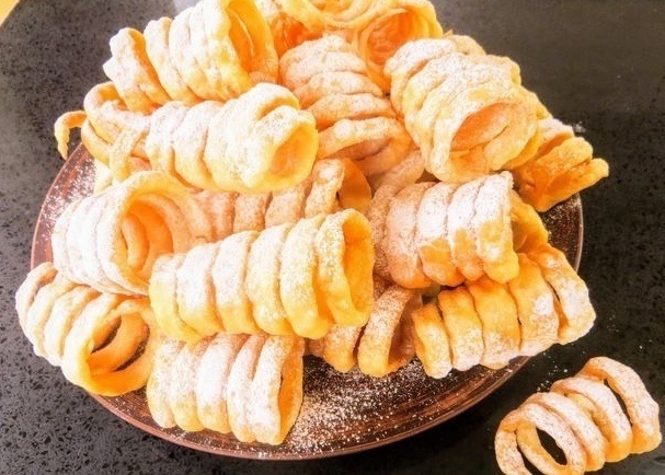 Теперь вставьте полоски теста на металлические трубочки или, в случае их отсутствия, используйте фольгу, сложив ее вдвое и накрутив на скалку. Обжарьте получившиеся спиральки в сковороде с горячим растительным маслом до золотистого цвета с обеих сторон. Важно не снимать их с трубочек во время жарки.