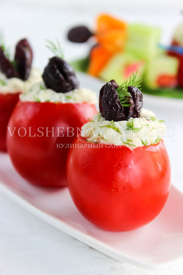 Украшаем закуску по своему усмотрению, используя маслины. Если выбираете маслины с косточками, нарежьте их крест-накрест и извлеките косточки. Подавайте закуску сразу же после приготовления, расчёт — по 3 помидора на порцию. Это блюдо получается нежным, сочным, с приятным ароматом чеснока и укропа, а маслины добавляют легкий солоноватый привкус.