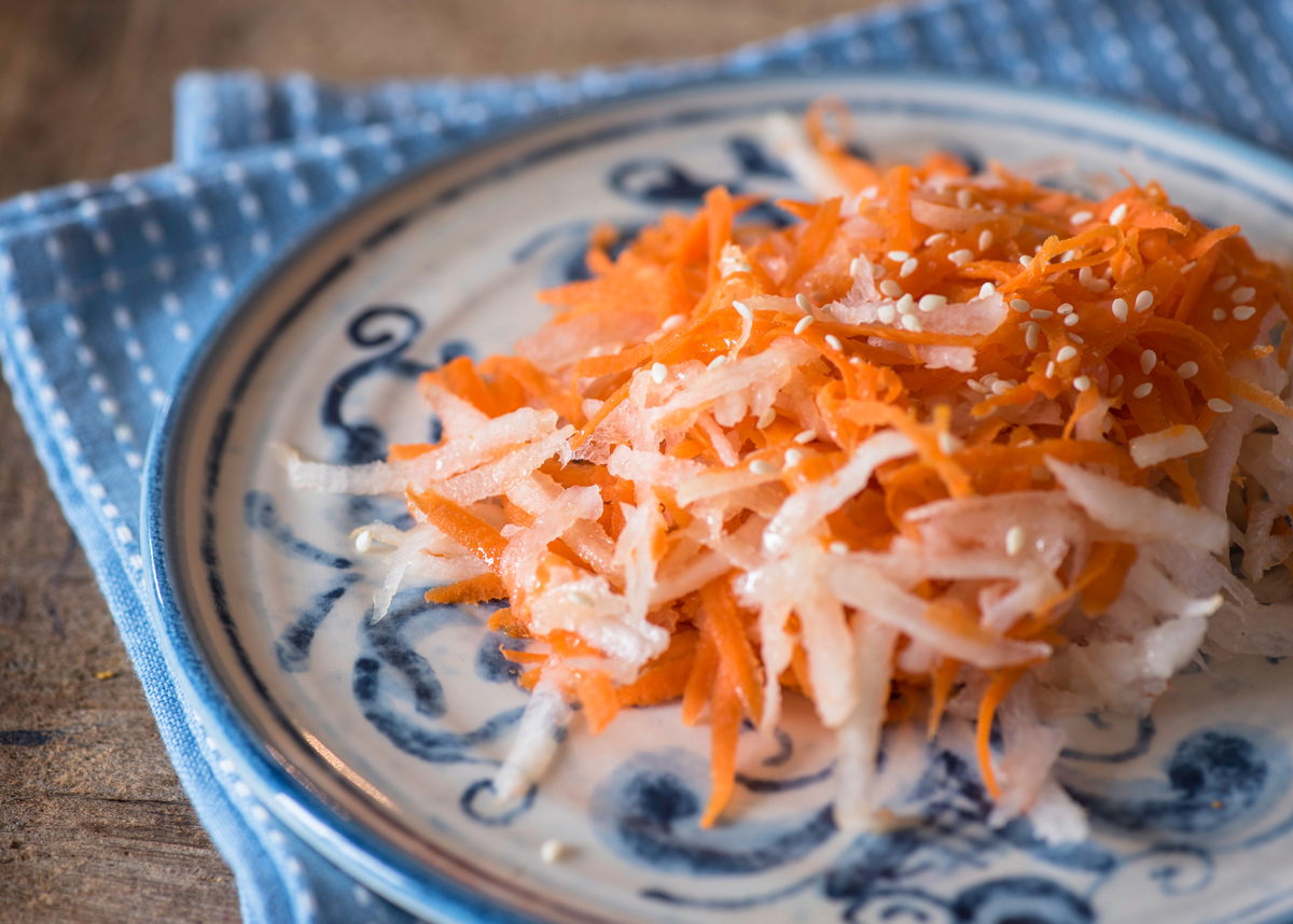 Порой самые простые блюда оказываются настоящими находками на кухне. Японский салат с дайконом — идеальное подтверждение этому. Всего из двух основных корнеплодов и пикантного кисло-сладкого соуса это блюдо взорвет ваши вкусовые ощущения. Завершают кулинарный шедевр обжаренные семена кунжута, которые придают ему обилие текстур и аромата.