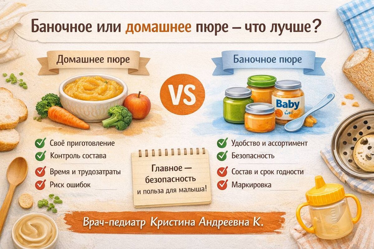 Оба варианта пюре имеют право на жизнь. Многие родители выбирают комбинированный подход: домашнее пюре для более старших детей, а баночки — в ситуациях, когда готовка невозможна. За безопасность и натуральность всегда ответственны сами родители. Вопрос лишь в том, что удобнее — использовать готовое пюре или приготовить его самостоятельно?