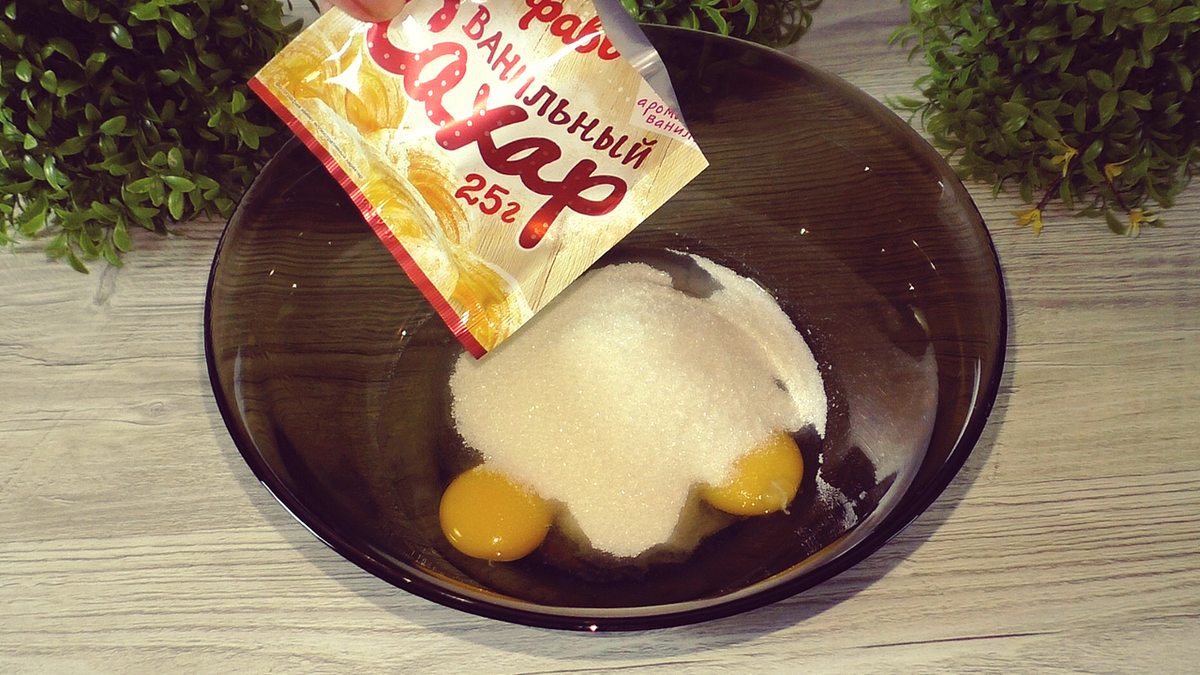 В миске соедините яйца с сахаром, ванильным сахаром и щепоткой соли. Перемешайте все ингредиенты венчиком, не прибегая к миксеру.