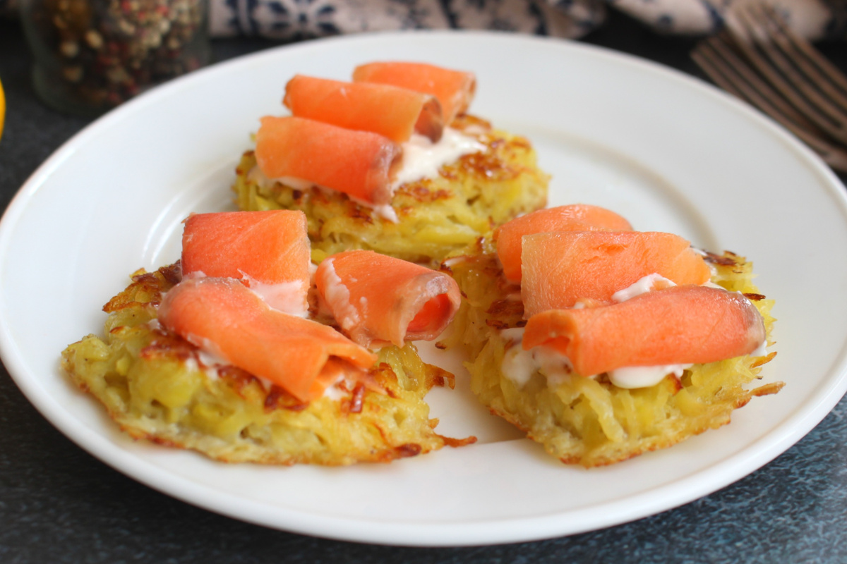 У этой закуски довольно простое и лаконичное название – Закуска из красной рыбы. Однако на самом деле в ней главную роль играют аппетитные картофельные оладьи, а красная рыба лишь подчеркивает их вкус. Выбор рыбы здесь совершенно не ограничен: подходит как соленая, так и слабосоленая, в зависимости от ваших предпочтений. А что касается оладьев, их можно сделать как плоскими, так и пышными, приготовив на сковороде или запекши в духовке.