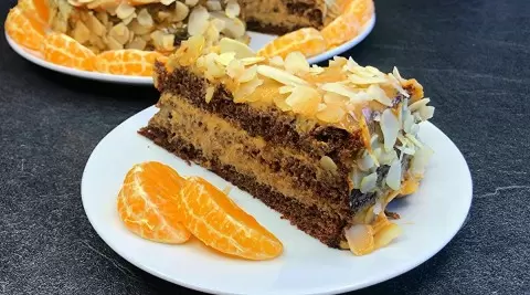 Тесто переносится в подготовленную форму и отправляется в разогретую до 170°C духовку на 40-45 минут. Проверка готовности происходит с помощью зубочистки: если она выходит сухой, торт готов. Когда корж остынет, его нарезают на три равные части, а затем обильно смазывают кремом из вареной сгущенки и сметаны. Для украшения можно использовать миндальные лепестки или крошки, оставшиеся от выпечки.