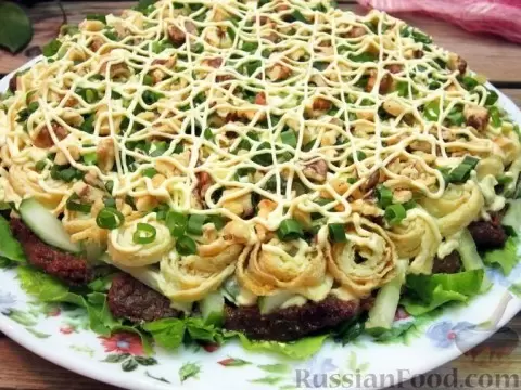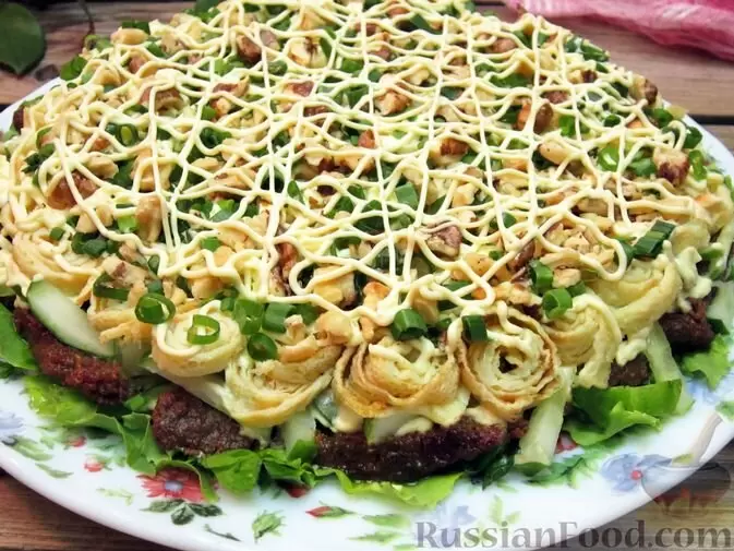 - Мясной салат с яичными блинчиками - роскошное сочетание жареной телятины, хрустящих свежих огурцов и нежных яиц, дополняется грецкими орехами для пикантности.