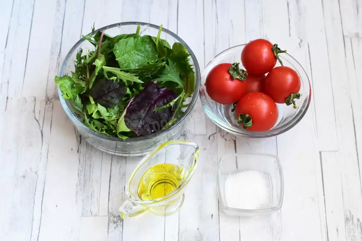 Чтобы начать, подготовьте все необходимые продукты. Помидоры можно использовать как черри, так и обычные. Черри делают блюдо более привлекательным. Салатные листья могут быть как магазинными, так и собранными на вашем огороде.