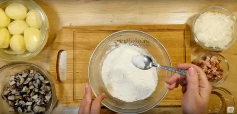 Начинка включает обжаренное сало, которое нарезается мелкими кубиками. Затем к нему добавляется мелко нарезанный лук, до появления золотистой корочки. Далее, в сковороду вводятся грибы, изначально отваренные. В самом конце обжаривания приправьте начинку солью и перцем.