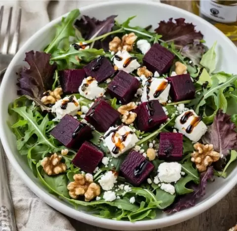 В этом салате сочетаются яркие вкусы, где нежная сладость печёной свёклы встречается с насыщенностью козьего сыра, а хрустящие орехи вносят особый шарм. Это простое, но элегантное блюдо станет настоящей изюминкой на любом столе и порадует даже самых требовательных гурманов.
