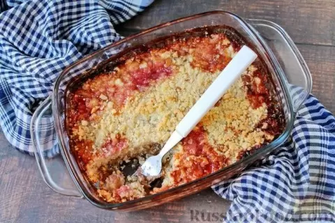 Ореховый крамбл с ревенем: Этот пирог из крошечного песочного теста с орехами станет отличным завершением вечера. Нежная начинка из стеблей и пряностей придаёт ему уникальный вкус, который не оставит равнодушными.