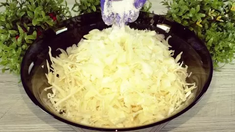 1. Начать следует с нашинкования капусты. Ее следует тщательно помять с нарезанным луком и солью, чтобы капуста сократилась в объеме и стала мягче.