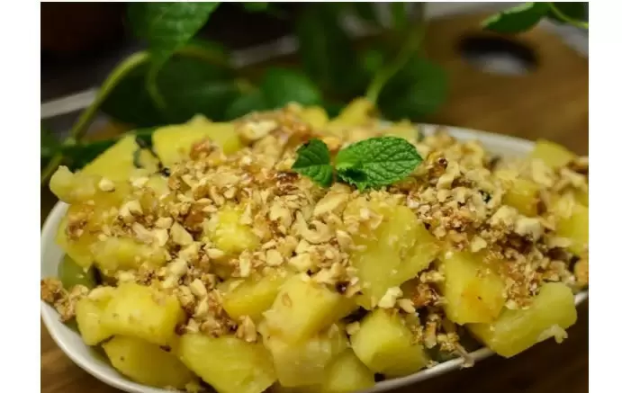 - Готовый салат украсить половинками грецкого ореха и, при желании, посыпать корицей.