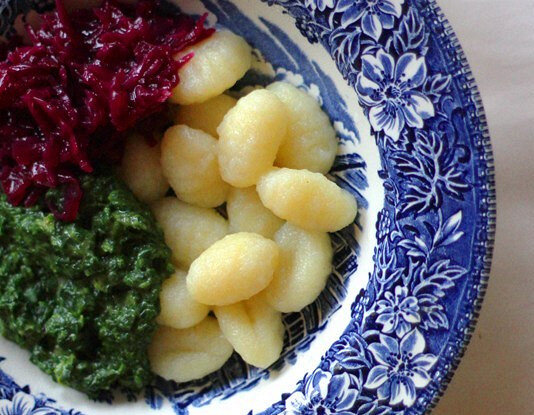 Готовые картофельные клецки разложить по тарелкам и щедро полить шпинатным соусом. Это блюдо порадует не только своим вкусом, но и ярким внешним видом.