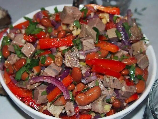 Мясной салат с говядиной и фасолью — настоящее находка для тех, кто желает разнообразить своё вечернее меню. Этот салат подается холодным и может стать отличным основным блюдом. Он не только сытный, но и очень ароматный, благодаря свежим овощам и специй.