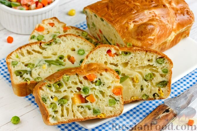 Не забываем и о выпечке! Пёстрый пирог на кефире, наполненный разноцветными овощами, станет отличным дополнением к первым блюдам. Сочетание кукурузы, стручковой фасоли и моркови придаёт пирогу особую изюминку. Он не только красивый на срезе, но и очень вкусный!