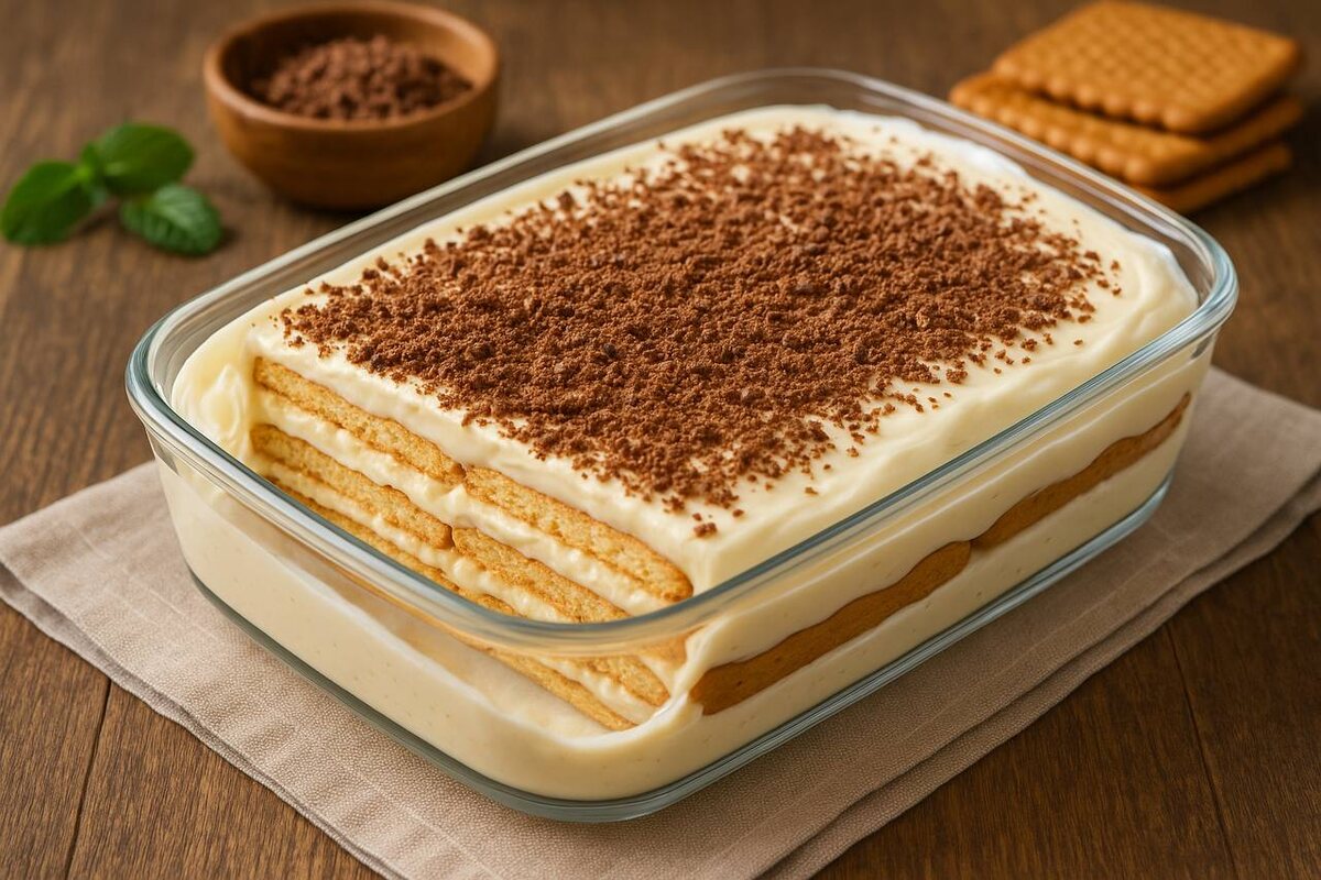 - Сборка: Выложите слой печенья на дно формы. Если печенье слишком сухое, смочите его в молоке или чае, чтобы оно не размокло. Затем равномерно распределите крем и повторите процесс, пока не исчерпаете все ингредиенты. Завершите кремовым слоем.