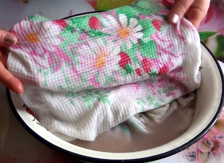 Первым делом, полотенце следует тщательно смочить теплой водой и натереть хозяйственным мылом. В качестве альтернативы можно использовать антипятин, что также даст хорошие результаты.