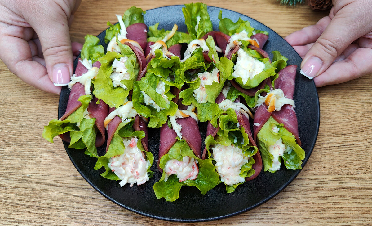 Основные ингредиенты в данной закуске сочетают крабовые палочки, тонкую говяжью нарезку, яйца, хрустящий салат и капельку майонеза. Легко и быстро, но эффектно. Необходимо лишь следовать простым шагам!