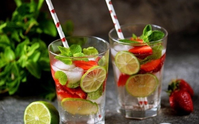 Первым делом тщательно промойте клубнику и лайм под проточной водой, дайте им обсохнуть. Не забудьте хорошенько промыть и мяту. Стаканы для напитка лучше выбирать емкостью от 300 мл, чтобы кофеин и фрукты могли комфортно "расселиться" внутри. На дно стакана положите немного льда.
