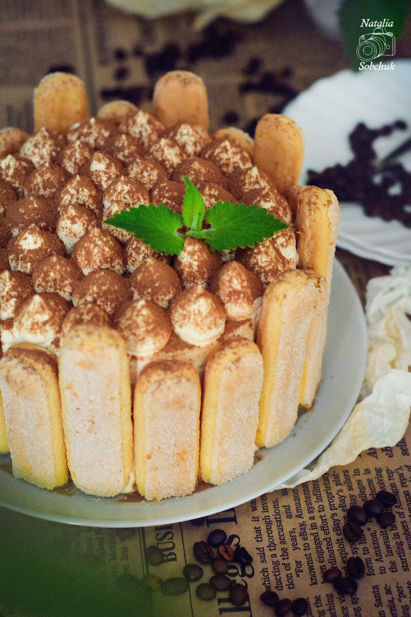 3. Сборка торта: Пропитать бисквит остывшим кофе, чередуя слои: бисквит, крем, шоколад. Повторять процесс до использования всех ингредиентов, завершая слоем крема и украшением из печенья Савоярди и какао.