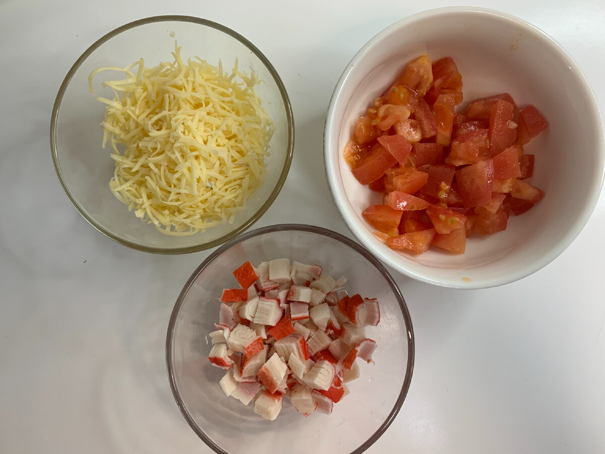 1. Подготовка ингредиентов. Крабовые палочки и помидоры нарезать кубиками, сыр натереть на мелкой терке. Оптимально использовать сыр Гауда, но подходящий на ваше усмотрение.