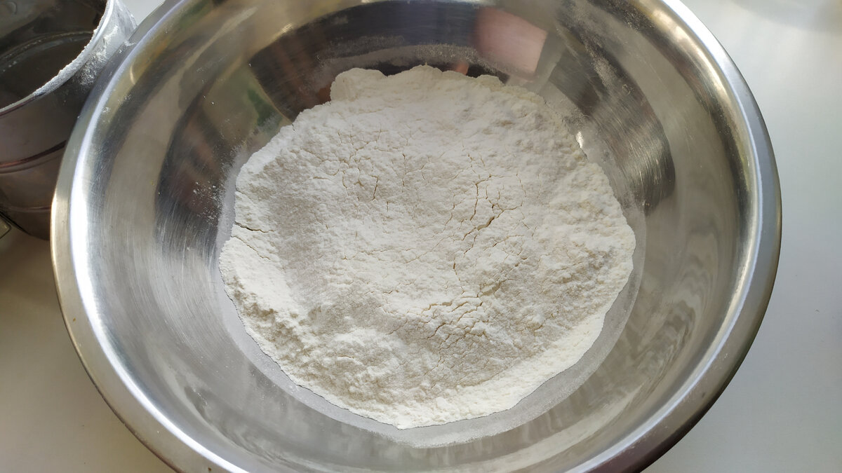 Начинаем с просеивания муки, что придаст тесту легкость и воздушность. К муке добавляются сахарная пудра, соль, сухие дрожжи и перемешиваются.