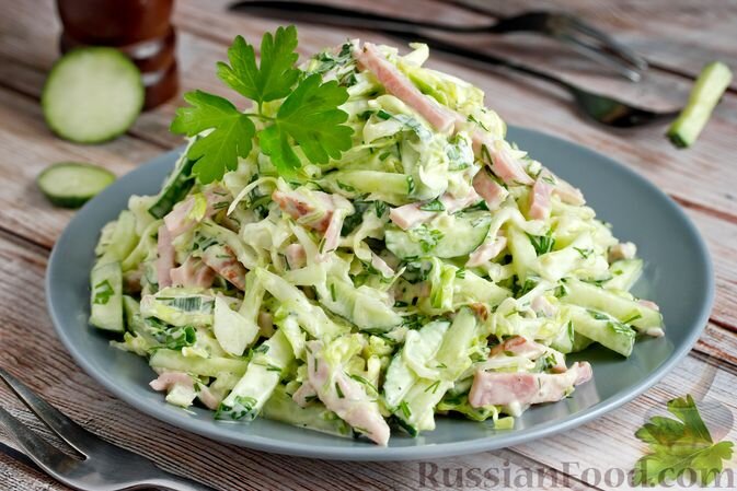 1. Салат из молодой капусты, огурцов и ветчины. Этот хрустящий и легкий салат с чесночно-майонезной заправкой станет настоящим хитом на любом ужине. Ингредиенты не требуют термической обработки, что существенно экономит время на приготовление.
