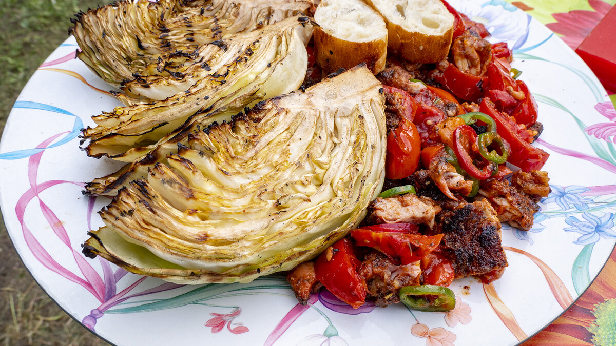 Капусту нарезать четвертями, присолить и разместить на решетке гриля, чтобы нижняя сторона пропекалась и подрумянивалась. Готовить капусту около 30 минут – она должна стать мягкой, но с легкой хрустящей корочкой. Накрыть гриль для инициирования процесса запекания.