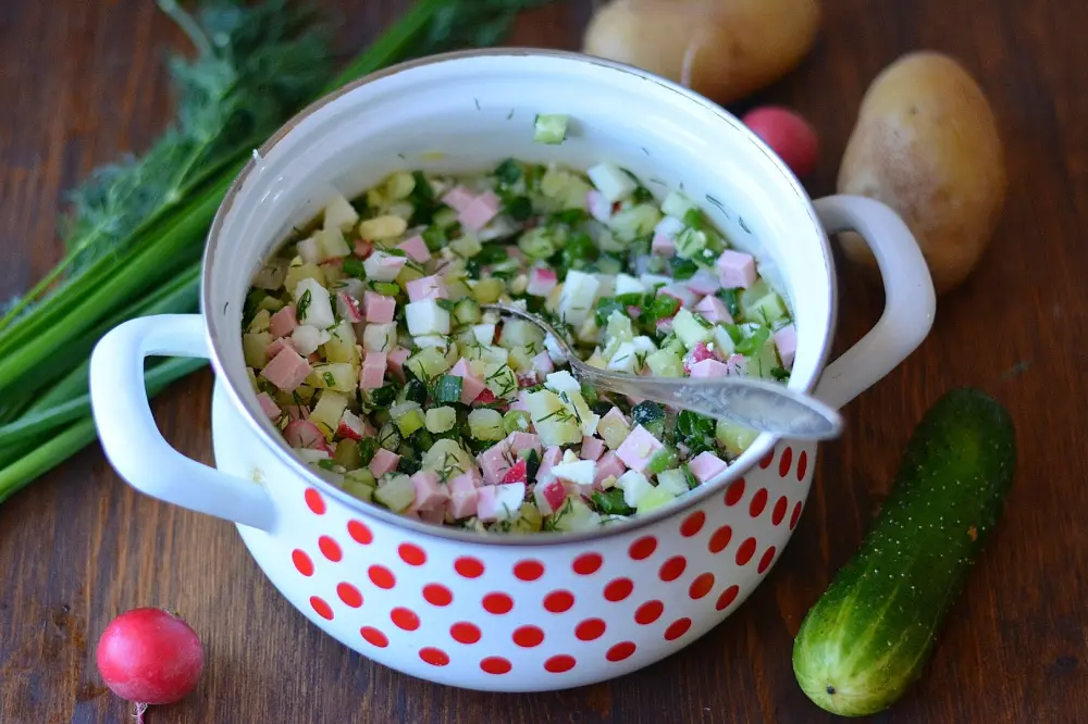 Примечательно, что картофель в традиционную окрошку не входит. В некоторых уголках России все же практикуют добавление холодной картошки прямо в суп, тогда как в других регионах ее подают отдельно, но горячей, в качестве гарнира.