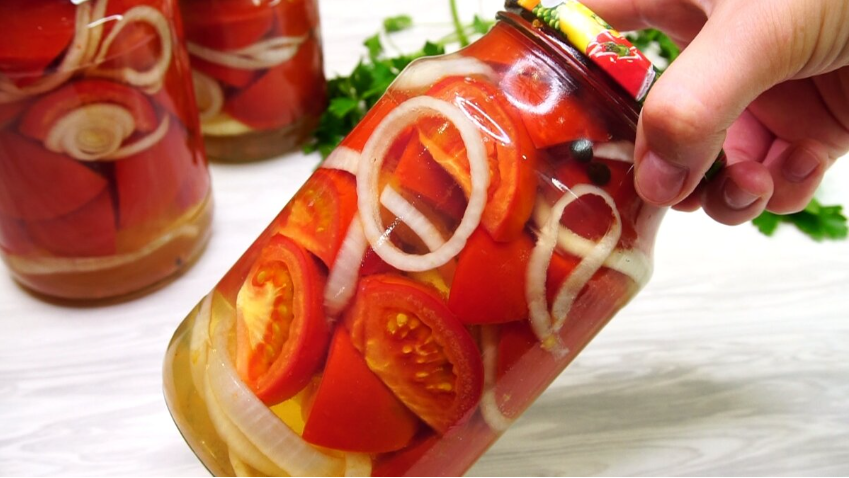 Для начала нарежьте помидоры на 2 или 4 части, а луковицы — кольцами. В стерилизованные банки укладывайте слоями: лук и помидоры, чередуя их.