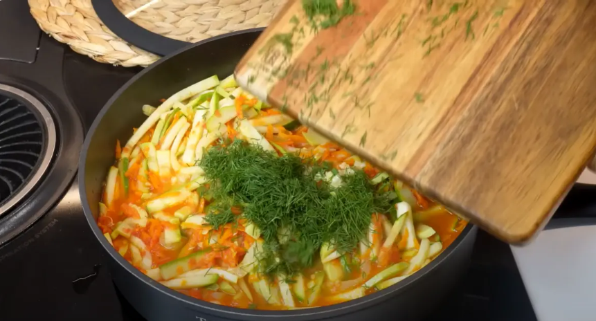 4. В завершение добавьте кабачки, накройте крышкой и готовьте на медленном огне 7-10 минут. По окончании времени добавьте оставшиеся зубчики чеснока и нарезанную зелень, перемешайте.