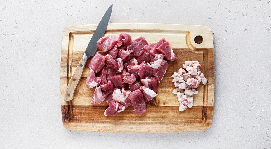 Свинину нарезать тонкими полосками, размер которых не превышает 7 мм. Если присутствует жир, его можно порезать на мелкие кусочки.