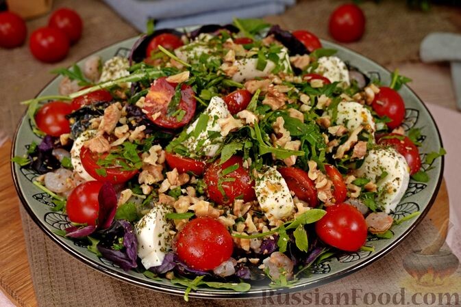 Этот салат удивит гостей изысканным вкусом. В его составе обжаренные на сливочном масле креветки с чесноком, помидоры черри, свежая моцарелла и грецкие орехи. Заправка из оливкового масла, лимонного сока и горчицы придаст блюду легкость и яркость.