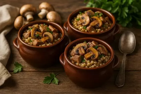 - При запекании перловка в горшочках становится рассыпчатой и впитывает ароматы соуса и специй, создавая гармоничное сочетание.