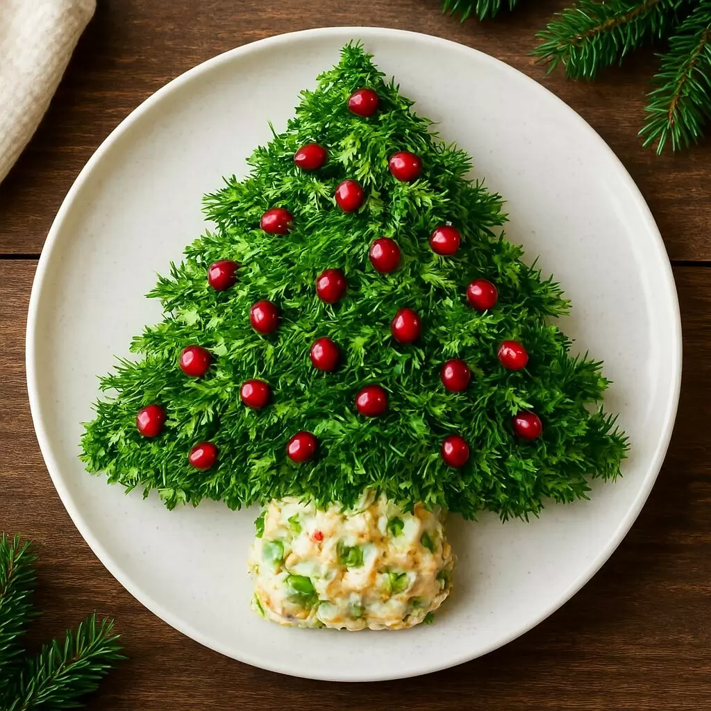 4. Чтобы добавить красоты, украсьте салат веточками укропа и петрушки, а блики «игрушек» создайте с помощью гранатовых зёрен или зерен кукурузы.