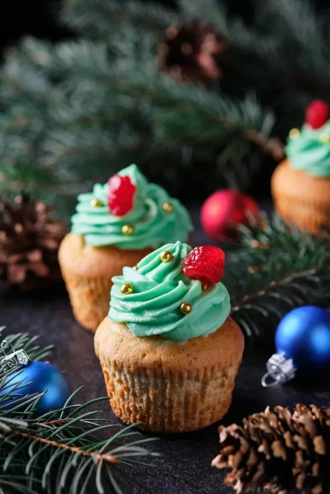 Остывшие кексы украсьте кремовой шапочкой, формируя ее в виде ёлочки. Добавьте золотистые шарики и красный цукат в качестве звезды или бантика.