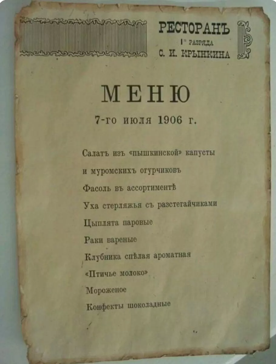 Иван Сергеевич Шмелёв иногда сталкивается с критикой за свою идеализированную картину дореволюционной Москвы. Однако давайте взглянем на реальность через меню ресторана Степана Васильевича Крынкина от 7 июля 1906 года. Несмотря на то, что в названии упоминается С. И. Крынкин, фактически заведением управлял именно С. В. Крынкин. Вспомним известный фрагмент из произведения Шмелёва: