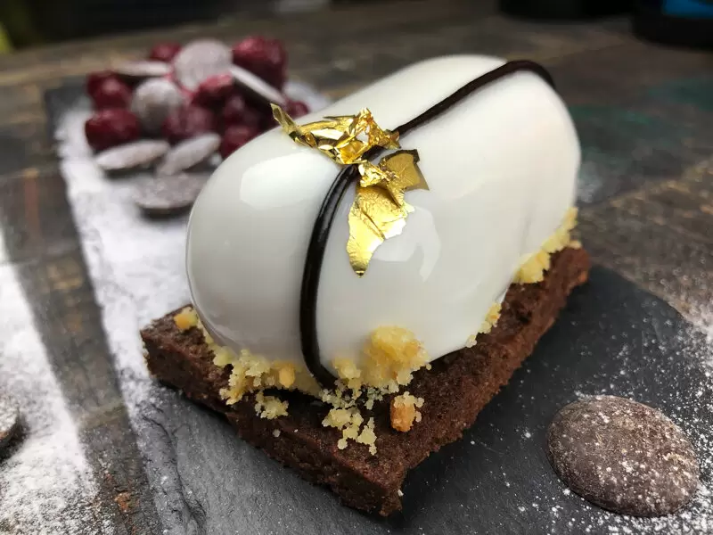 Снаружи десерт обходит внимание благодаря белой шоколадной капсуле, покрытой глянцевым глазурем. Шоколадные декорации завершают образ и добавляют яркость этому лаконичному творению.