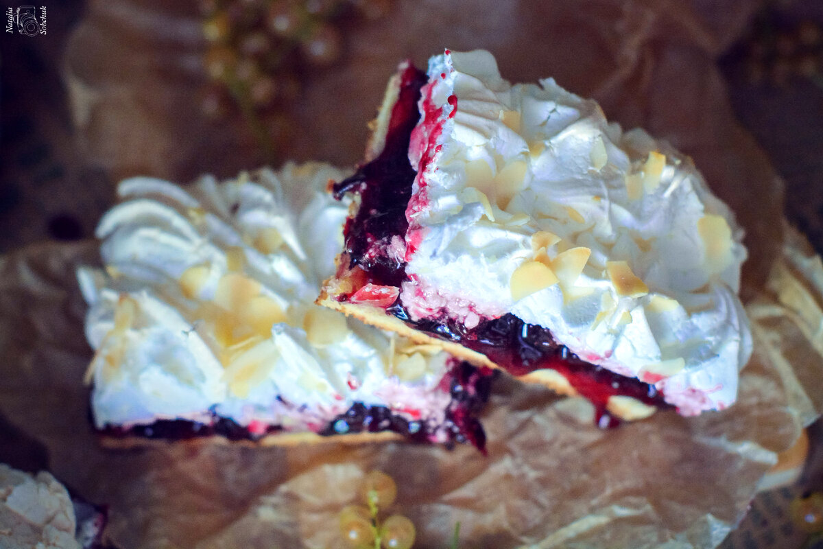 На горячий корж выложить смородиновую начинку, а затем безе, используя кондитерский мешок, покрыть пирог равномерно. Выпекать в разогретой до 150°C духовке в течение 35 минут. После выпекания выложить пирог на решетку и полностью охладить.