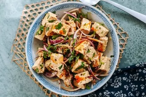 Лян Бань Доу Фу переводится как "тофу с холодной заправкой", и это не просто блюдо, а стрит-фуд с мощным вкусом и минимальными усилиями. Основными ингредиентами соуса являются чеснок, соевый соус, немного сахара и черного перца вместе с кунжутным и чили масла. Вдобавок в рецепте присутствует свежесть от красного лука и кинзы. Эту закуску можно без труда собрать за считанные минуты, используя обычный твердый тофу, который легко найти в любом супермаркете.