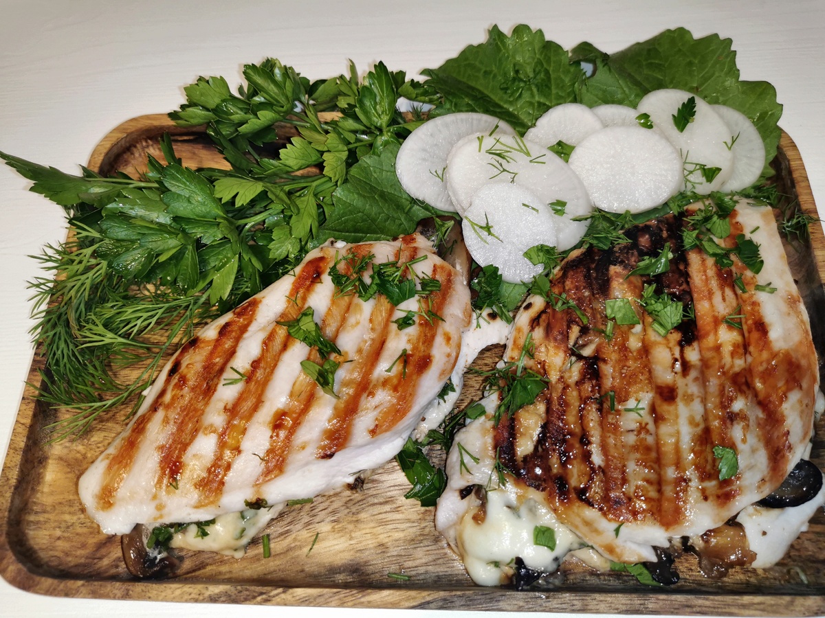 На одну половину куриного филе выложите обжаренные грибы, зелень и моцареллу, затем закройте второй половиной. Поместите получившиеся "кармашки" на нижнюю часть электрогриля и накройте верхней частью.