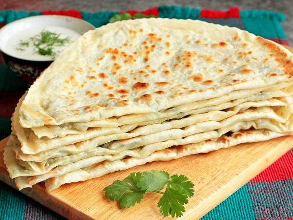 3. Формируем и выпекаем гёзлеме: От теста отщипываются небольшие кусочки, которые раскатываются в тонкие лепешки толщиной около 2 мм. На одну половину лепешки выкладывают начинку, а затем накрывают второй половиной и защипывают края. Лепешки обжариваются на нагретой сухой сковороде до золотистой корочки с обеих сторон.