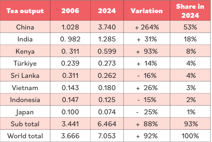 В 2024 году объем производства чая составил впечатляющие 7,05 миллиона тонн. Лидерами стали Китай и Индия, которые вместе произвели почти 78% всего чая на планете: Китай достиг отметки в 3,74 миллиона тонн, а Индия — 1,28 миллиона тонн.