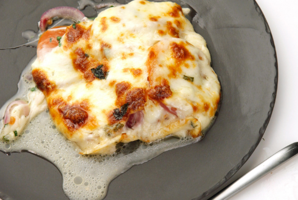 Разогрейте духовку до 200-220 градусов и отправьте форму с блюдом запекаться на 7-10 минут. Как только сыр расплавится и образуется аппетитная корочка, можно доставать из духовки.
