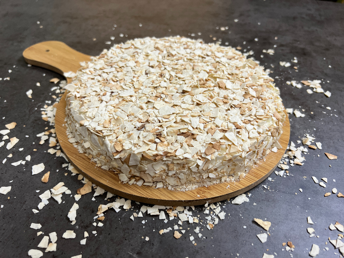 6. Измельчите поджаренные кусочки лаваша с помощью блендера и обсыпьте ими торт снаружи.
